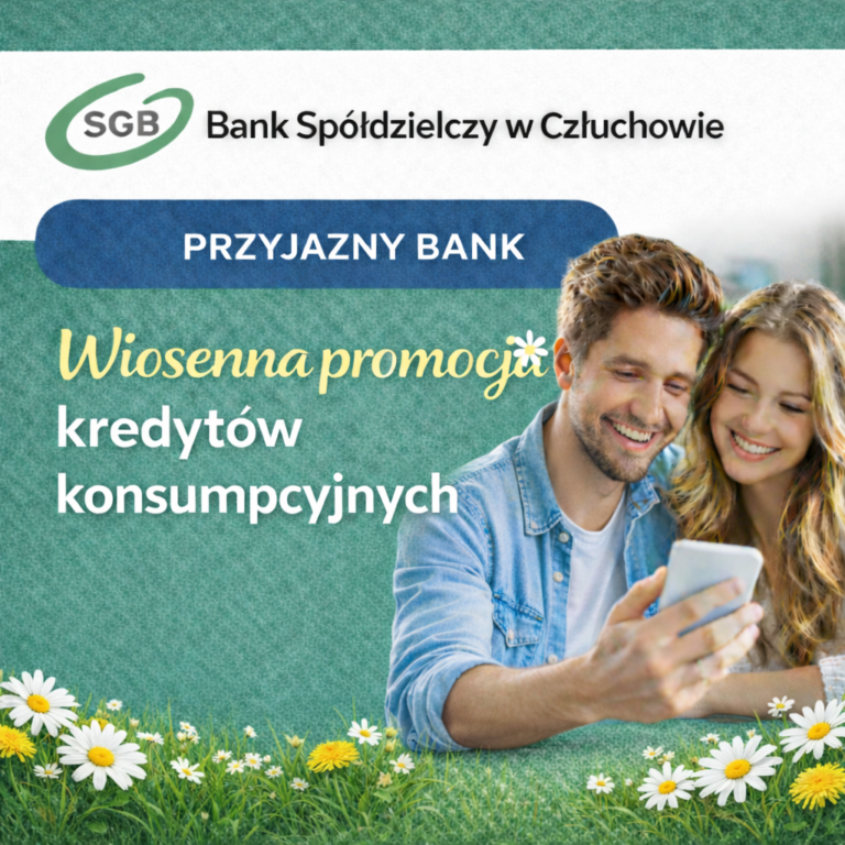 Wiosenna Promocja kredytów konsumpcyjnych • Kredyt od 500 zł do 255 500 zł, • Bez prowizji, • Maksymalny okres kredytowania: do 8 lat, • Atrakcyjne stałe oprocentowanie, • Możliwość wcześniejszej, bezpłatnej spłaty kredytu, • Czas trwania promocji od 16.02.2026 r.